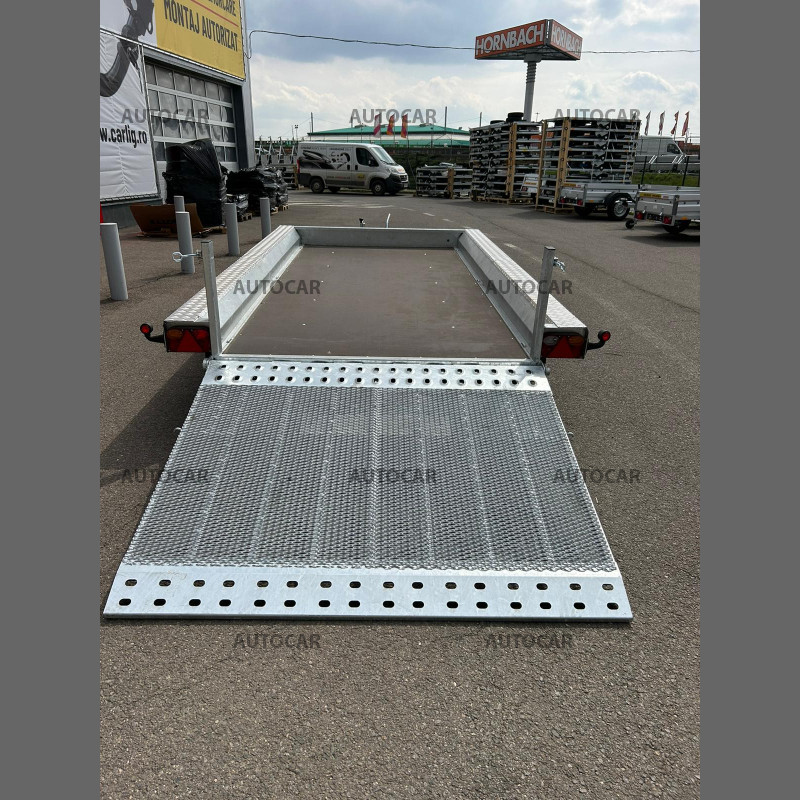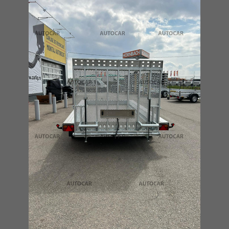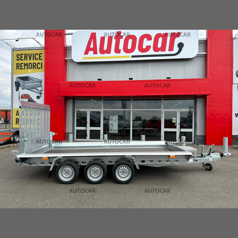railer pentru transport utilaje in constructii, cu rotile langa platforma de incarcare. Constructia este robusta din otel galvanizat.
