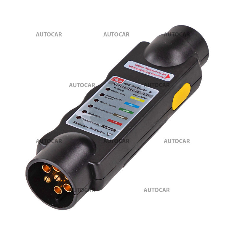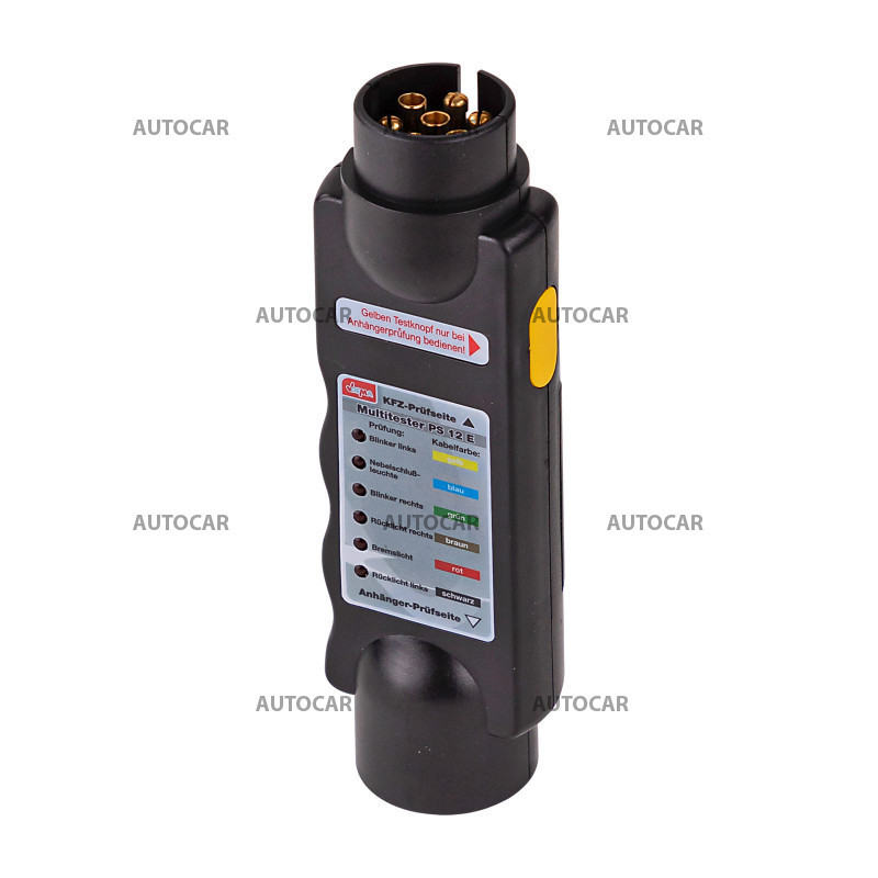 Inspecție rapidă și ușoară a sistemului de iluminare de pe vehicul și remorcă. Testerul este pur și simplu conectat la priză sau ștecher în curs de testare, butonul de testare este apăsat și se face o diagnoză clară prin intermediul afișajului LED, erorile sunt afișate direct. Datorită puterii interne a bateriei, nu este necesară nicio sursă de alimentare externă (motor în funcțiune, baterie auto etc.). De asemenea, remorcile nu trebuie să fie conectate la vehicul (nu trebuie să fie în modul de testare). Ideal pentru ateliere, închiriere de mașini și remorci, magazin de accesorii. Poate fi folosit și cu un adaptor pentru mufe și prize cu 13 pini (nu sunt incluse în pachet). Carcasă PVC rezistentă la impact, dimensiuni compacte, 6 LED-uri de interogare. Testați comutatorul cu buton. Cerere prin conectare conform DIN 1724. Ușor de utilizat fără cunoștințe speciale. Funcționare cu o baterie de 9 V (nu este inclusă) folosind un comutator de testare sau direct pe vehicul prin intermediul electronicii de bord fără a utiliza un comutator de testare.