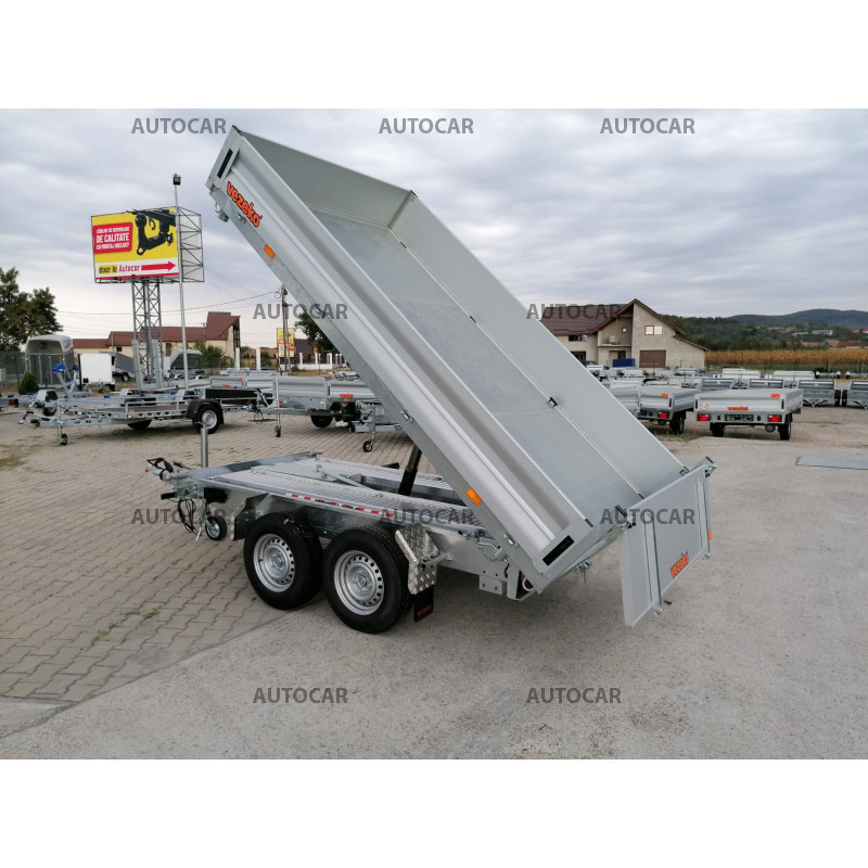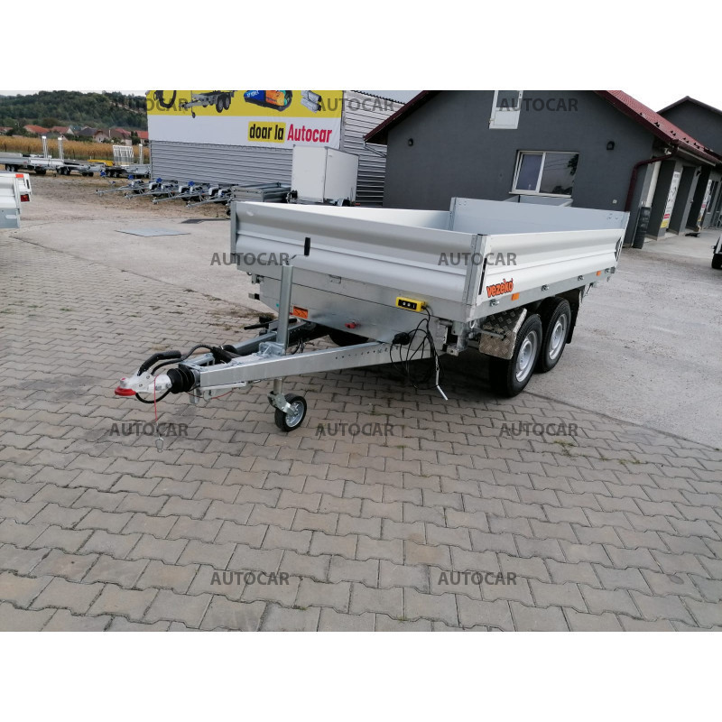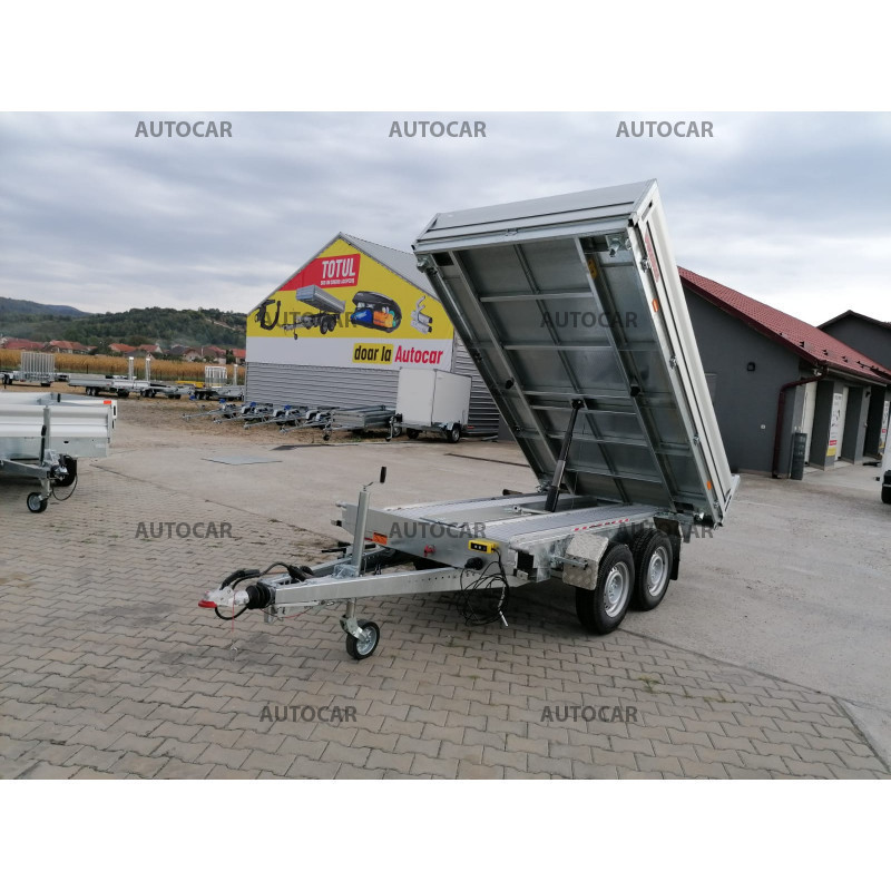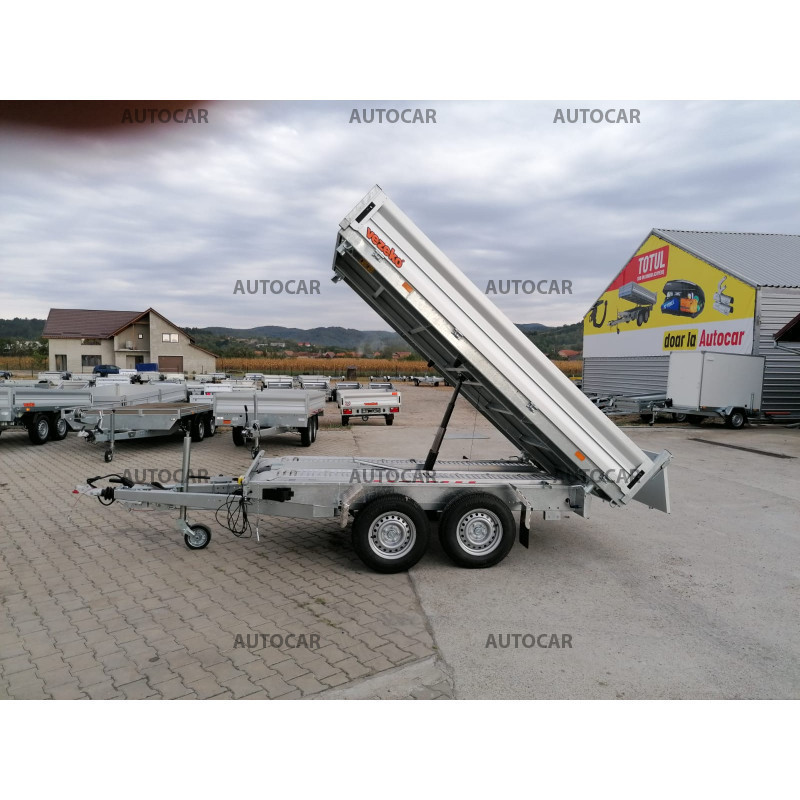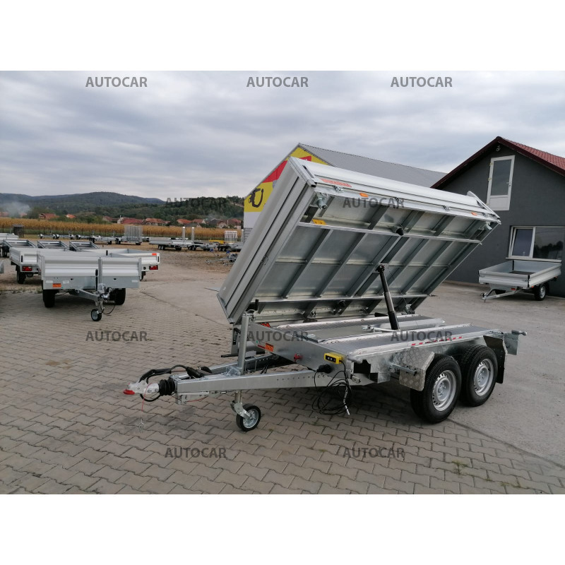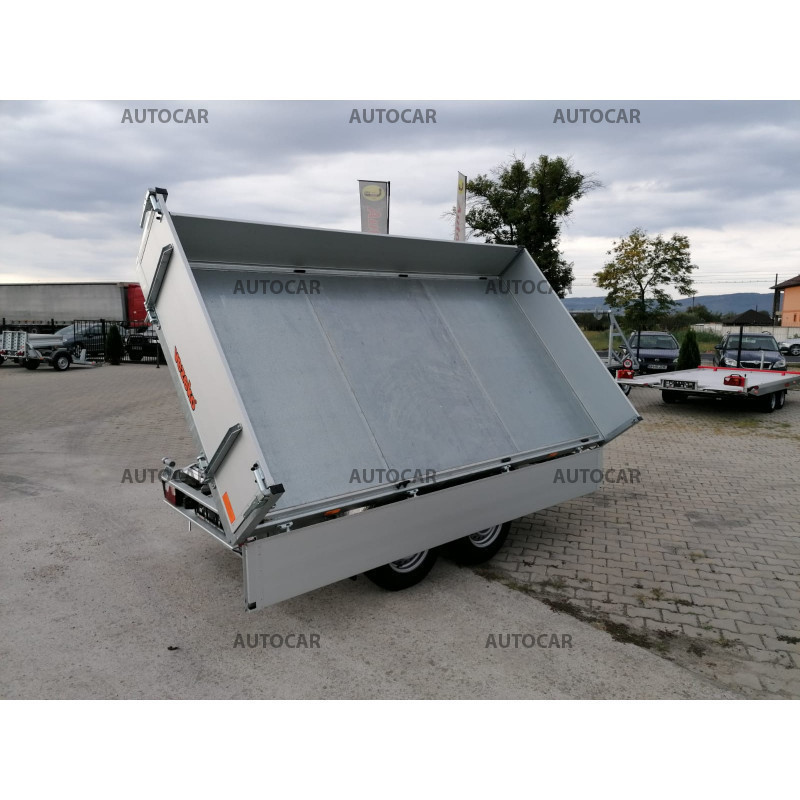 Remorca basculabila hidraulic pe toate cele 3 parti cu roti sub platforma de incarcare.Bascularea este ajustata cu un cilindru puternic.Remorca poate fi livrata cu un sistem electrohidraulic de basculare la telecomanda. Dotari standard cuprind obloane din aluminiu care se pot demonta,6 buc. de ancorare,podeaua din lemn stratificat impermiabil,antiderapant acoperit cu tabla zincata de 3 mm,roata de sprijin,pana blocare roata,roata de rezerva cu suport de prindere.Construcţia sasiului este robustă din oţel galvanizat, care garantează o viata de lungă durată.Remorca are garantie 2 ani si este construita pentru viteza de 100 km/h.