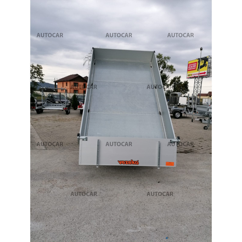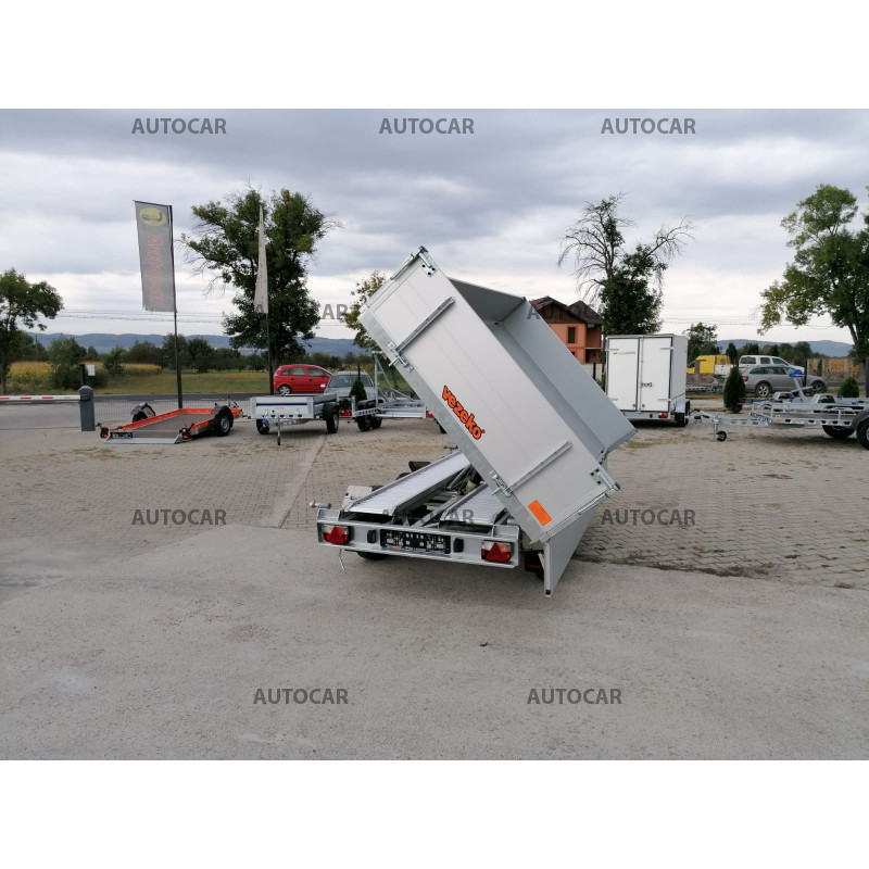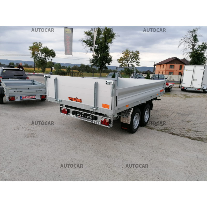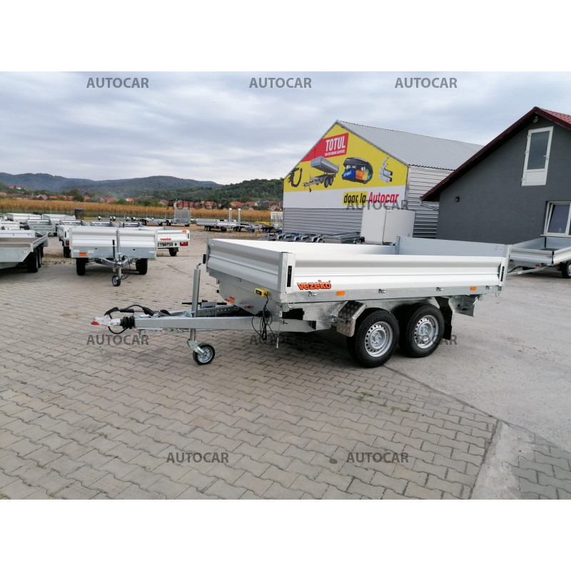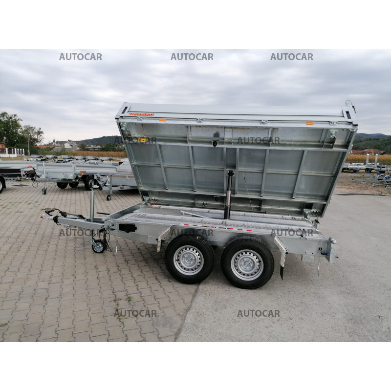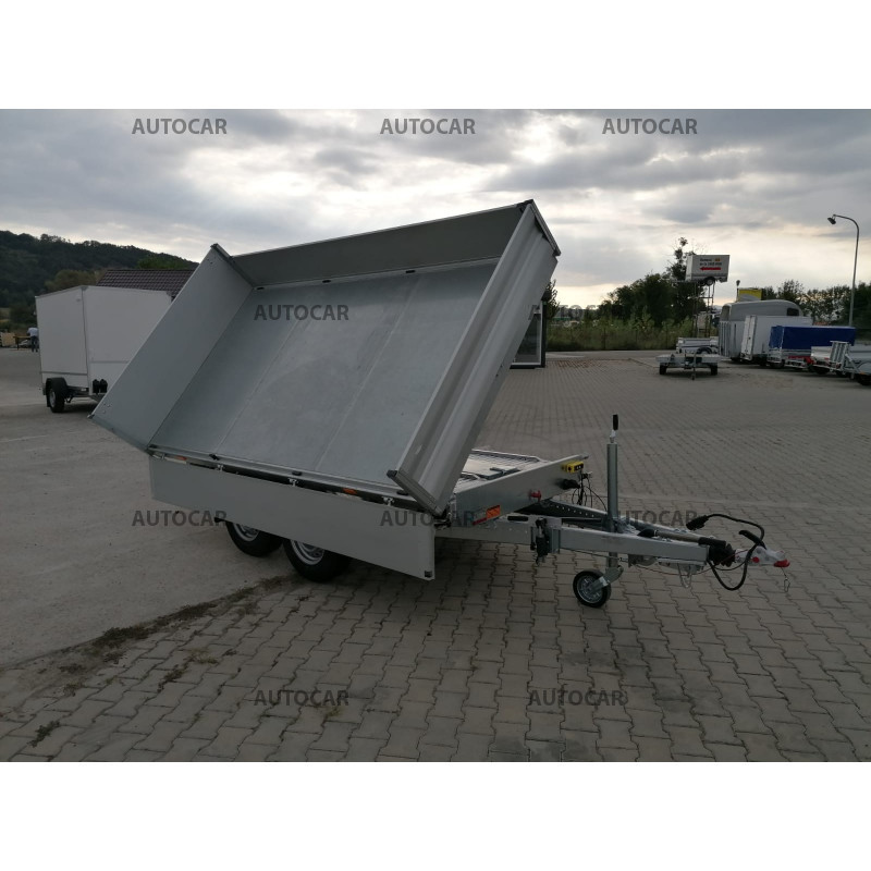 Remorca basculabila hidraulic pe toate cele 3 parti cu roti sub platforma de incarcare.Bascularea este ajustata cu un cilindru puternic.Remorca poate fi livrata cu un sistem electrohidraulic de basculare la telecomanda. Dotari standard cuprind obloane din aluminiu care se pot demonta,6 buc. de ancorare,podeaua din lemn stratificat impermiabil,antiderapant acoperit cu tabla zincata de 3 mm,roata de sprijin,pana blocare roata,roata de rezerva cu suport de prindere.Construcţia sasiului este robustă din oţel galvanizat, care garantează o viata de lungă durată.Remorca are garantie 2 ani si este construita pentru viteza de 100 km/h.