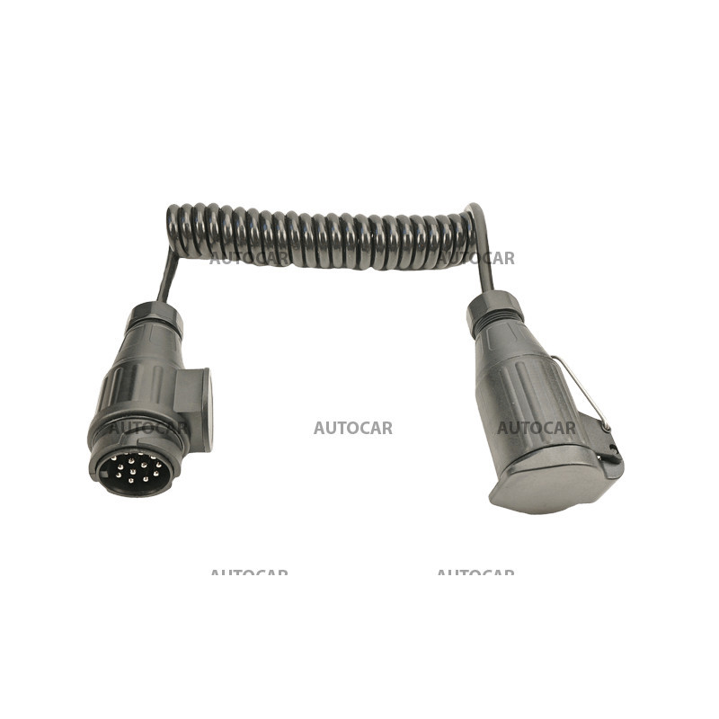 Adaptor de cablu spiralat pentru conectarea unei remorci cu ștecher cu 13 pini la o mașină cu o priză cu 13 pini. Este alcătuit dintr-o priză cu 13 pini, mufă cu 13 pini și cablu YLY 7x0,75mm2+1x1,00mm2 conceput pentru industria auto.