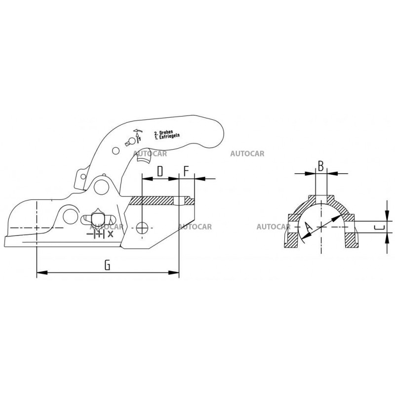 Cuplă de remorcare Knott cu o capacitate de încărcare de 2700 kg. Diametrul de prindere la țeavă este de 50 mm.