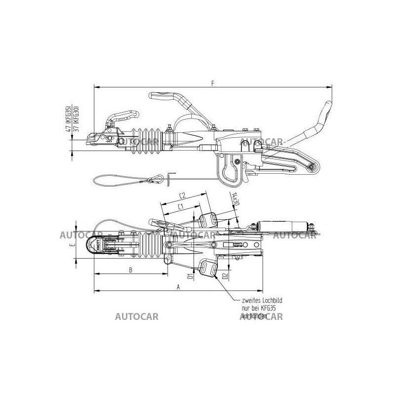 Frâna de depășire din fontă KNOTT de pe bara de tracțiune în formă de V este ideală pentru remorci cu o greutate maximă de până la 3500 kg. Cu posibilitatea unei sarcini verticale de până la 150 kg, oferă o soluție sigură și fiabilă chiar și pentru aplicații mai solicitante. Dimensiunile de montare ale acestei frane sunt optimizate pentru o instalare usoara: distanta dintre gaurile de montare E este de 140 mm, distanta dintre gaurile C este de 166/207 mm, iar lungimea totala D este de 203/224 mm. Datorită designului robust din fontă, această frână de supraîncărcare se caracterizează printr-o durabilitate excepțională și o durată lungă de viață, ceea ce o face o alegere ideală pentru remorci mai grele și condiții de operare solicitante.