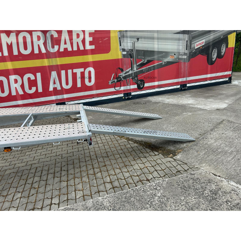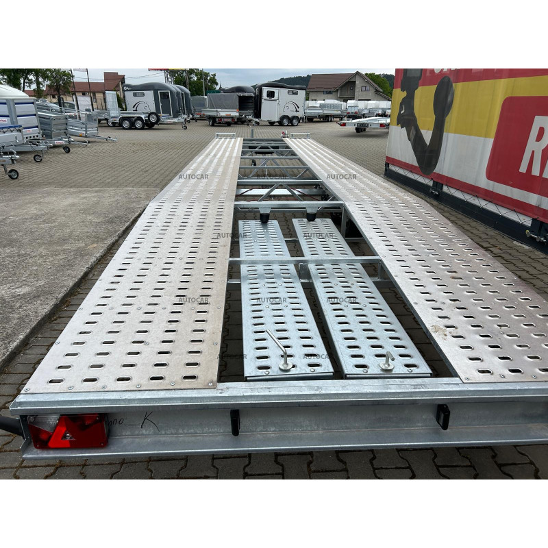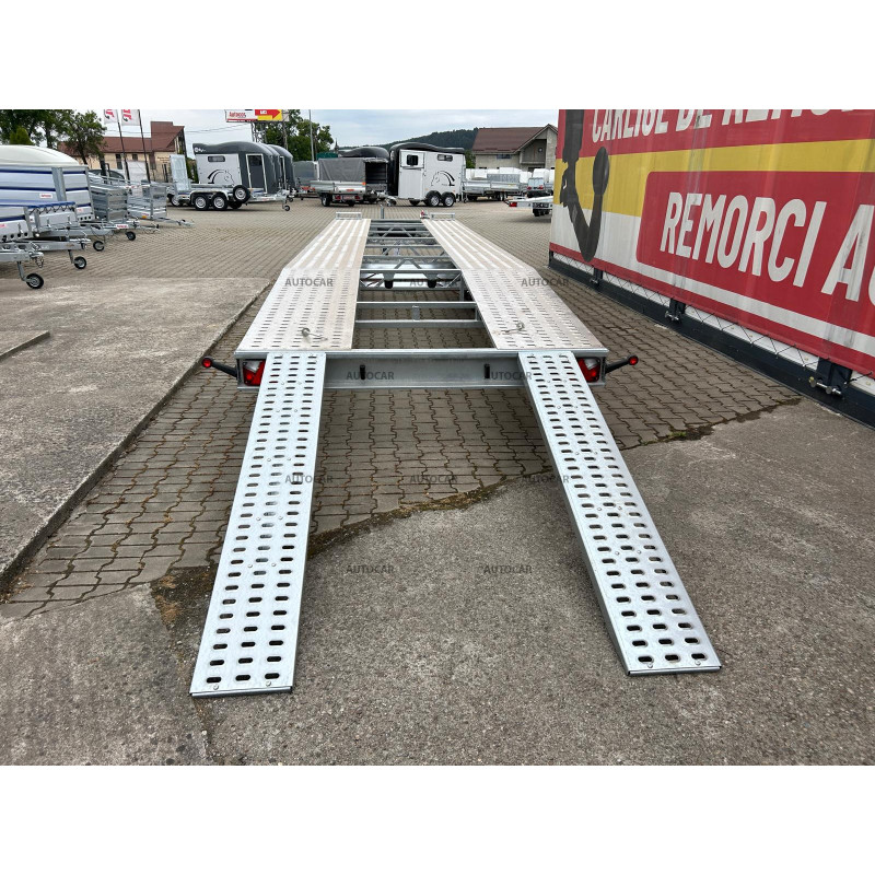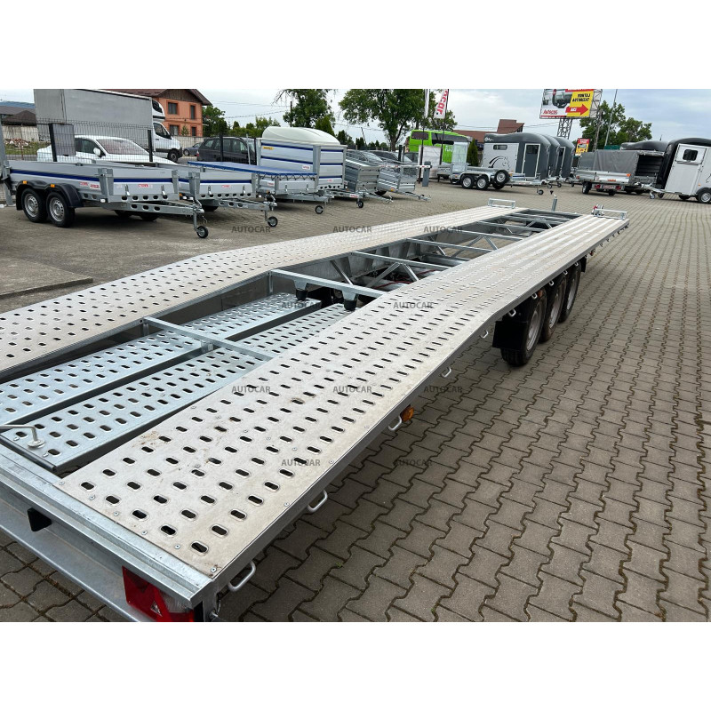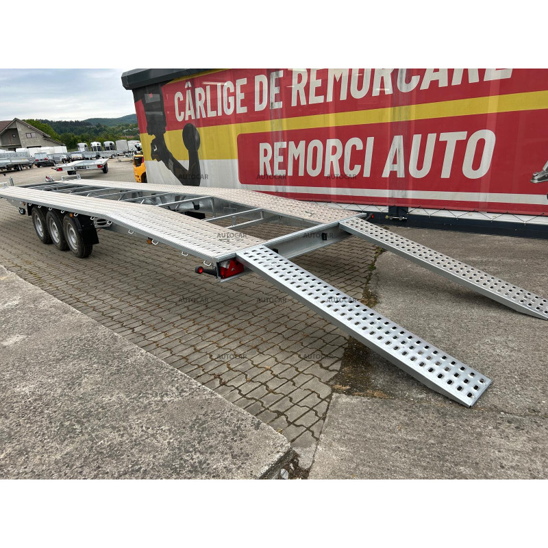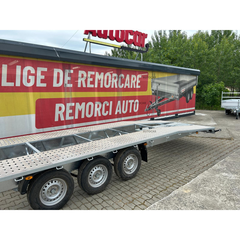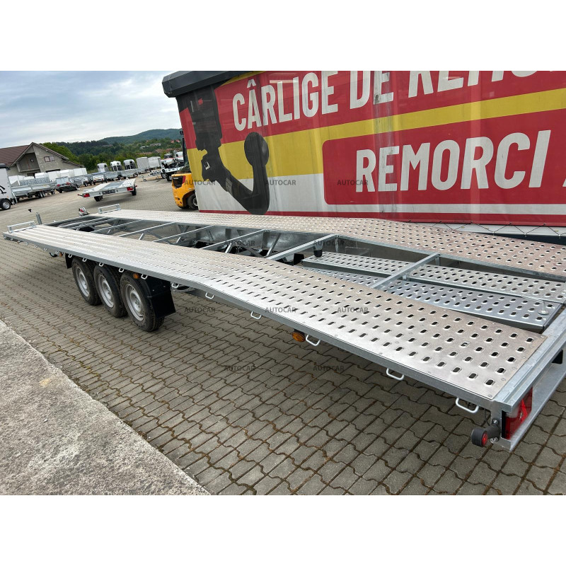 Această remorcă de marfă frânată cu trei axe este proiectată pentru transportul mașinilor și are un design unic, cu roți care sunt depozitate sub pat. Structura sa este realizată din construcție robustă din oțel, care a fost sudată șiulterior, galvanizată la cald, ceea ce asigură o rezistență ridicată la coroziune și o durată de viață lungă. viaţă. Prin calitatea și durabilitatea sa, această remorcă oferă o garanție de 2 ani, ceea ce arată încrederea în fiabilitatea și calitatea sa. Construcția sa a fost concepută pentru a permite transportul mașinilor cu viteze de până la 100 km/h, oferind astfel un transport eficient și sigur.