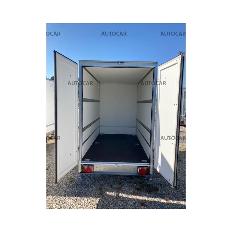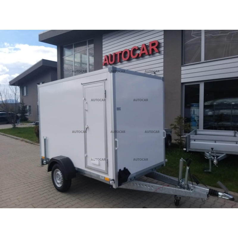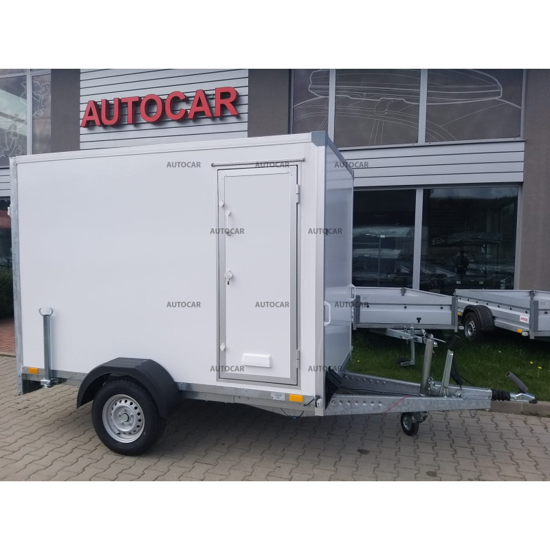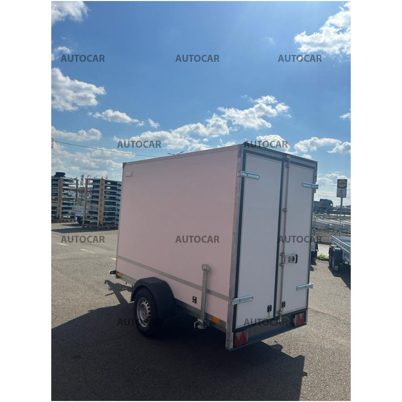 Remorcă cu un ax, frânată cu caroserie de până la 1300 kg este un vehicul de transport compact și practic, adesea utilizat pentru transportul diverselor încărcături. Noua versiune cu pereți izolați (sandwich) și podea din placaj rezistent la apă oferă un spațiu închis și protejează încărcătura de influențele externe nefavorabile și condițiile meteorologice. Caroseria este albă în versiunea standard. Remorca este echipată cu uși duble și uși laterale de service. Echipamentul de bază include prinderi pe podea, care sunt utilizate pentru fixarea încărcăturii cu curele sau sfori pentru a preveni mișcarea acesteia în timpul transportului. În plus, remorcile sunt dotate cu picioare de suport din spate, care stabilizează vehiculul în timpul încărcării și descărcării. De asemenea, sunt incluse cunele pentru asigurarea roților remorcii, pentru a preveni mișcarea acesteia în timpul staționării.