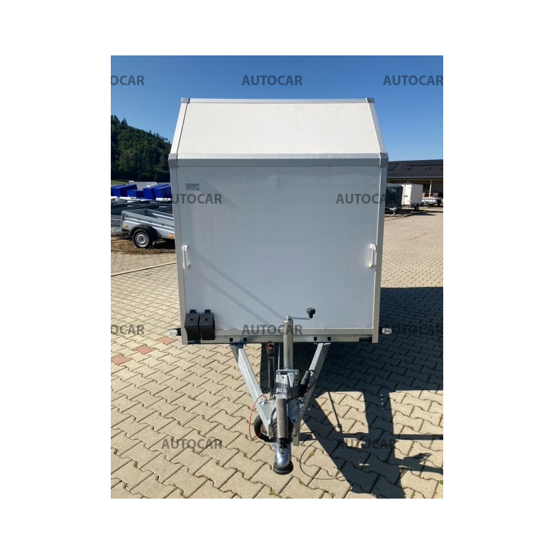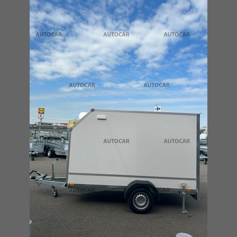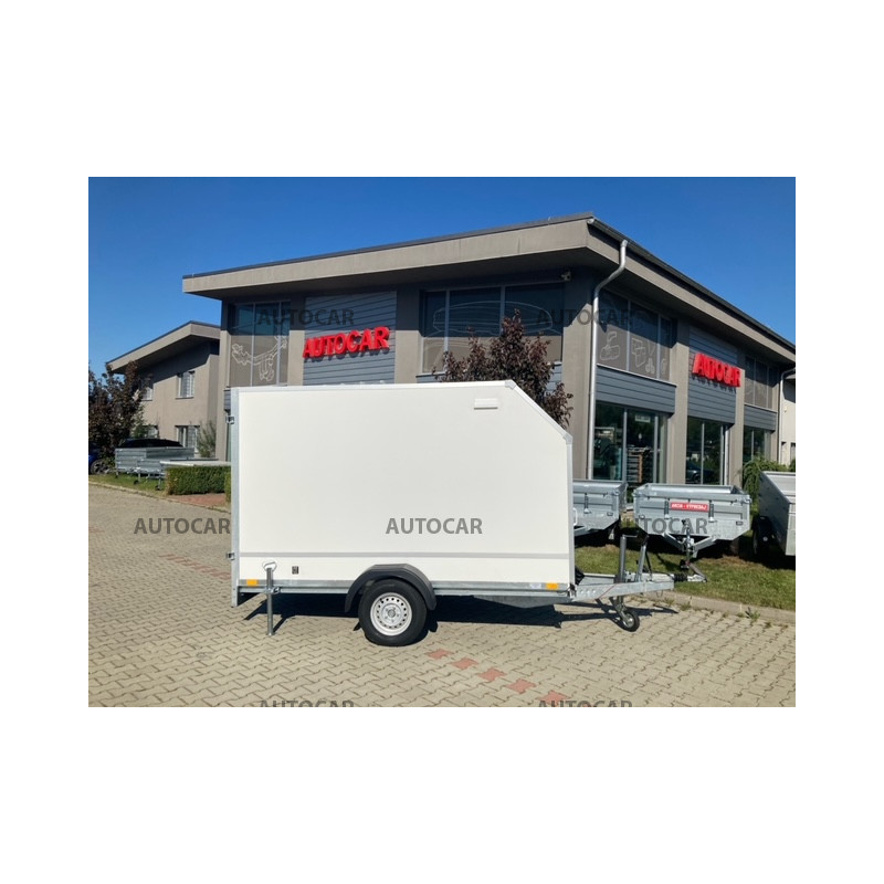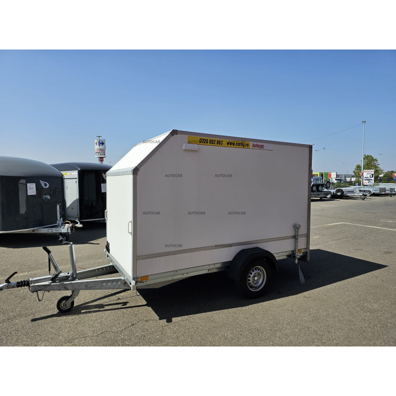 Remorcă cu un singur ax și frână cu caroserie cu înclinație de până la 1300 kg este un mijloc de transport compact și practic, adesea utilizat pentru transportul diferitelor încărcături. Pereții remorcii sunt fabricați din plăci, iar podeaua este din placaj rezistent la apă. În versiunea standard, caroseria este de culoare albă și are o rampă. Remorca este echipată cu o rampă spate care servește ca rampă de încărcare. Echipamentul de bază include prinderi pe podea, care sunt utilizate pentru fixarea încărcăturii cu curele sau frânghii, pentru a preveni mișcarea acesteia în timpul transportului. În plus, aceste remorci au picioare de suport spate care stabilizează vehiculul în timpul încărcării și descărcării încărcăturii. Alte componente sunt clapele de suport, care se folosesc pentru a bloca roata remorcii, prevenind astfel mișcarea în timpul staționării.