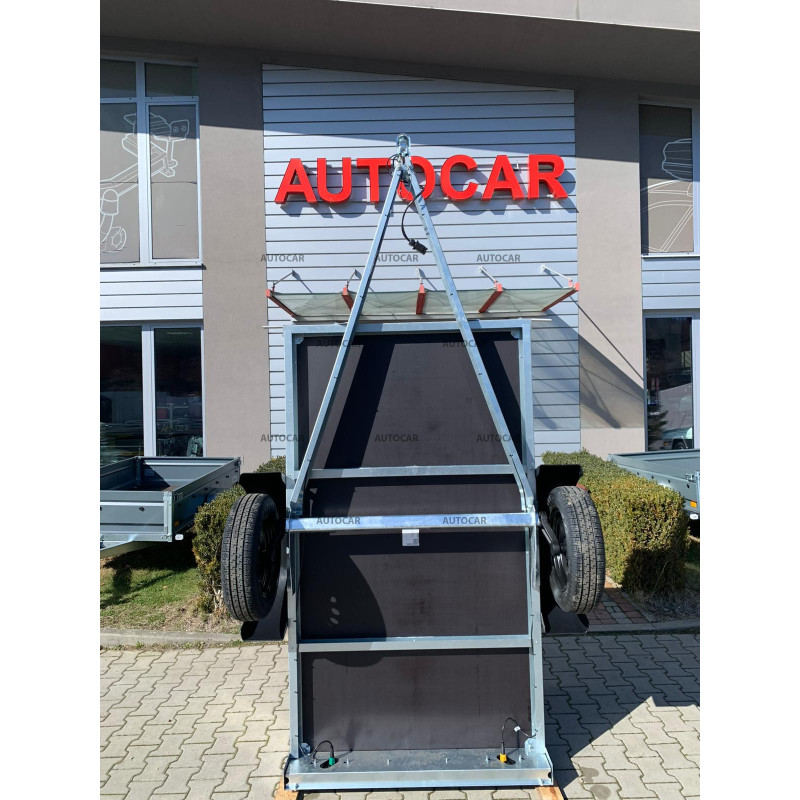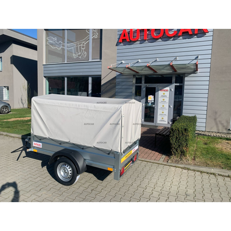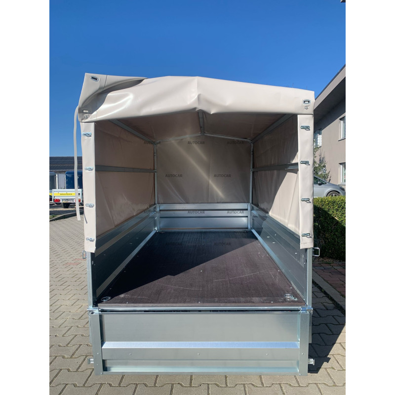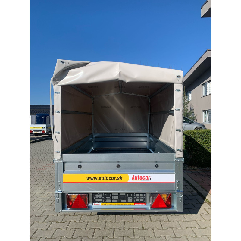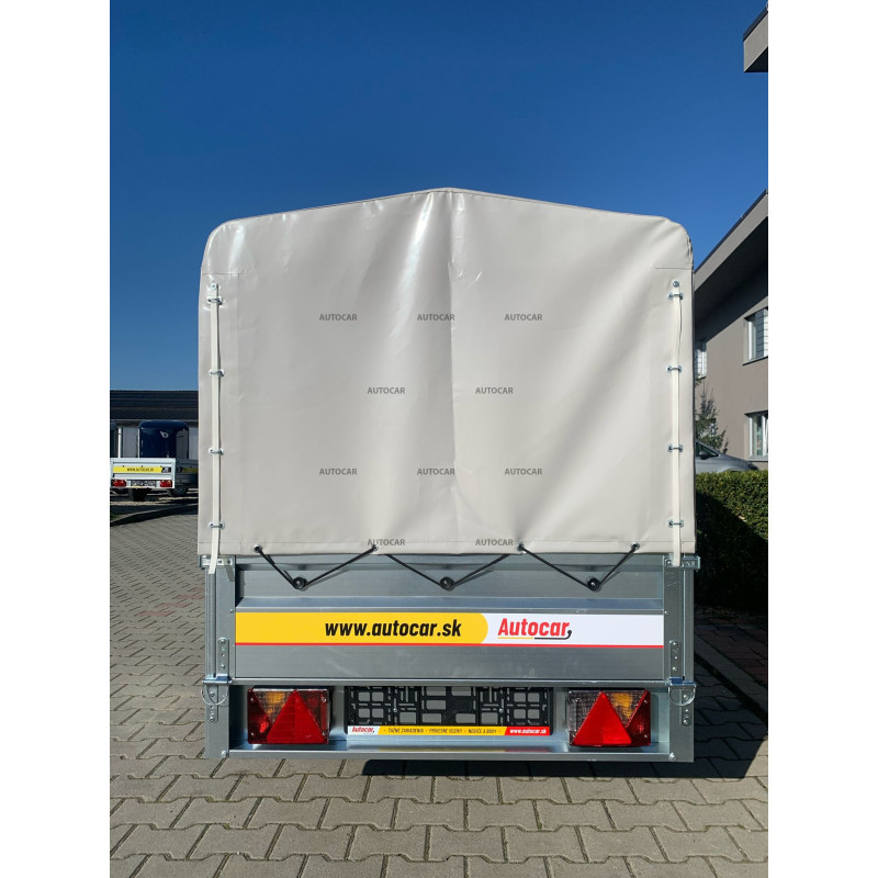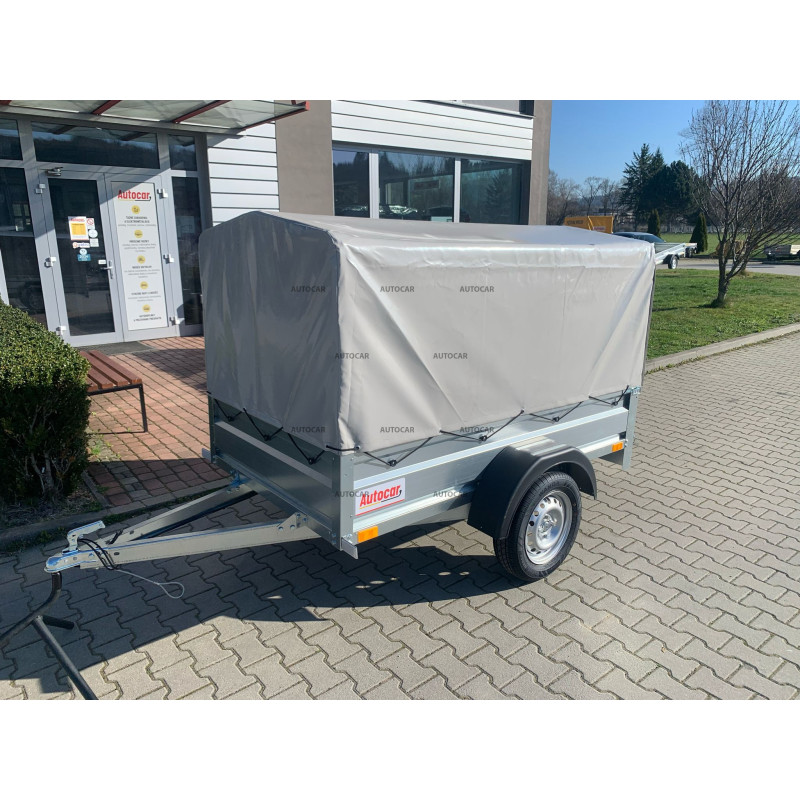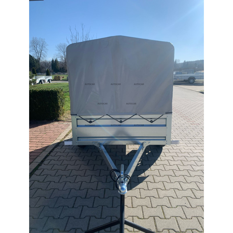 Remorcă defrânată o singură axă, cu prelată de 120 cm înălțime de la podeaua remorcii și cadru complet Construcția cu o înălțime de 6 cm și cele două elemente de rigidizare asigură o rezistență și o stabilitate ridicate chiar și atunci când este complet încărcată. Patru inele de ancorare sunt amplasate în podea pentru a fixa în siguranță sarcina. Căruciorul este echipat cu panouri laterale profilate rezistente, din tablă galvanizată, care garantează o durată lungă de viață și protecție împotriva coroziunii. Panou lateral posterior este deschis și detașabil , ceea ce facilitează încărcarea și descărcarea mărfurilor.