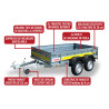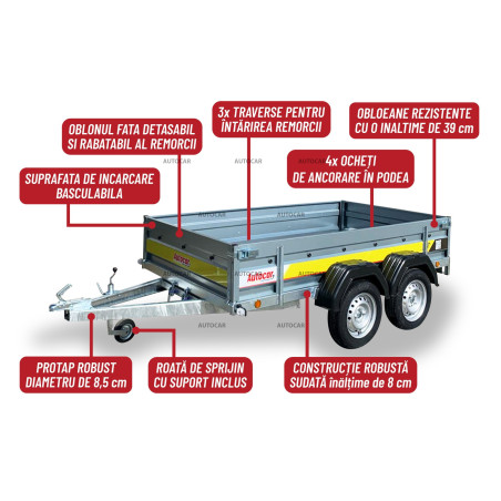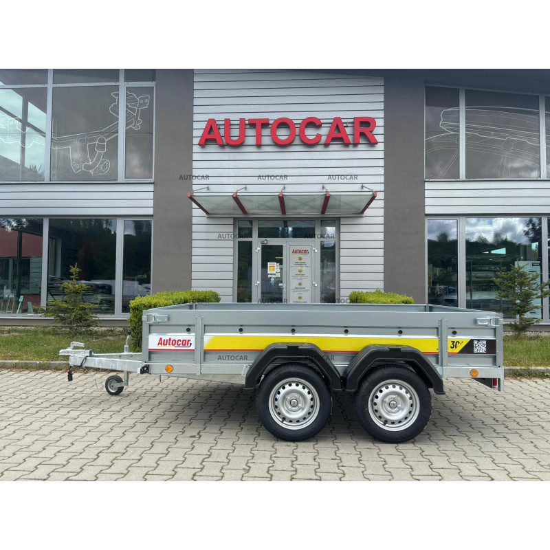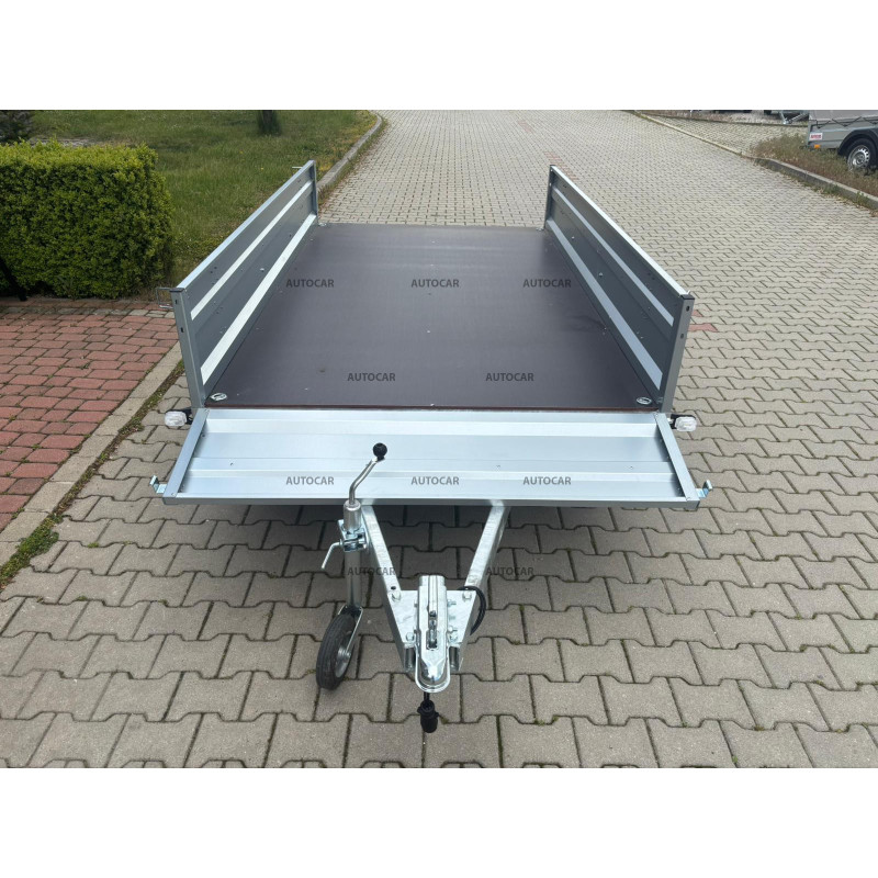 O remorcă pliabilă cu două axe defrânată , cu un cadru sudat robust (8 cm) și ranforsare transversală asigură stabilitate și durabilitate. Zona de încărcare de 2630 x 1540 mm, cu pereți laterali de 390 mm (grosime de 1 mm), oferă mult spațiu. Podeaua din placaj impermeabil cu inele de fixare permite fixarea sigură a încărcăturii. Căruciorul are o structură pliabilă pe bara de tractare (9 cm) pentru încărcare ușoară, o deschidere frontală frontală și roată de sprijin incluse în preț. Un ajutor fiabil și practic pentru transportul diverselor mărfuri.