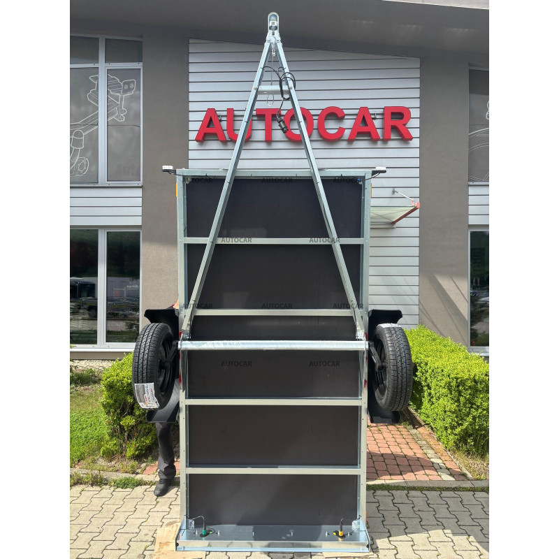 Remorcă cu o singură axă, defrânată , cu șasiu complet, înălțime de 6 cm, cu Patru întărituri transversale asigură rezistență și stabilitate ridicate chiar și sub sarcină maximă. Patru inele de ancorare sunt amplasate în podea pentru a fixa în siguranță încărcătura. Căruciorul este echipat cu panouri laterale profilate rezistente, din tablă galvanizată, care garantează o durată lungă de viață și protecție împotriva coroziunii. Înălțimea barei de tractare este de până la 9 cm . Panou lateral din spate este deschis și detașabil , ceea ce facilitează încărcarea și descărcarea mărfurilor.