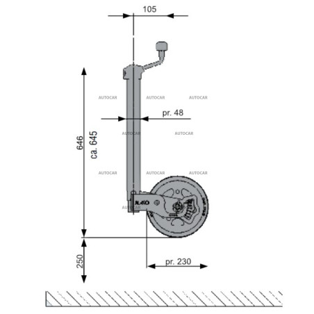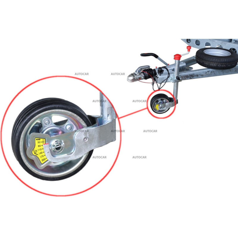 Roată de susținere AL-KO cu capacitate portantă de până la 300 kg, concepută pentru manipularea ușoară a remorcii și controlul încărcăturii.