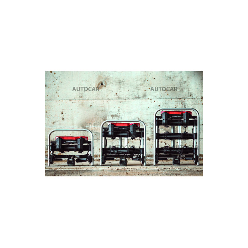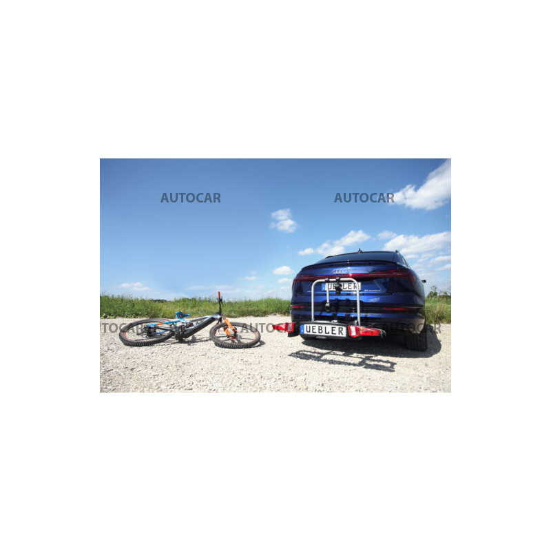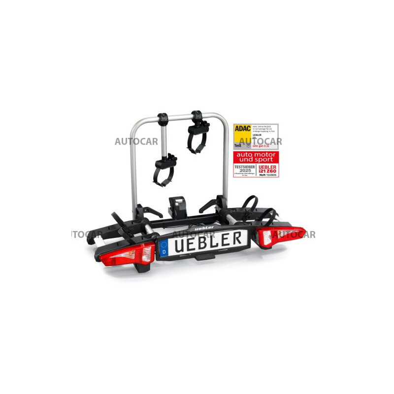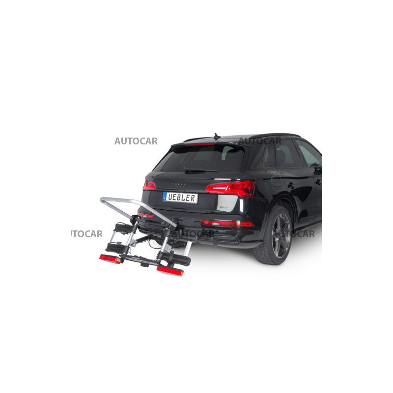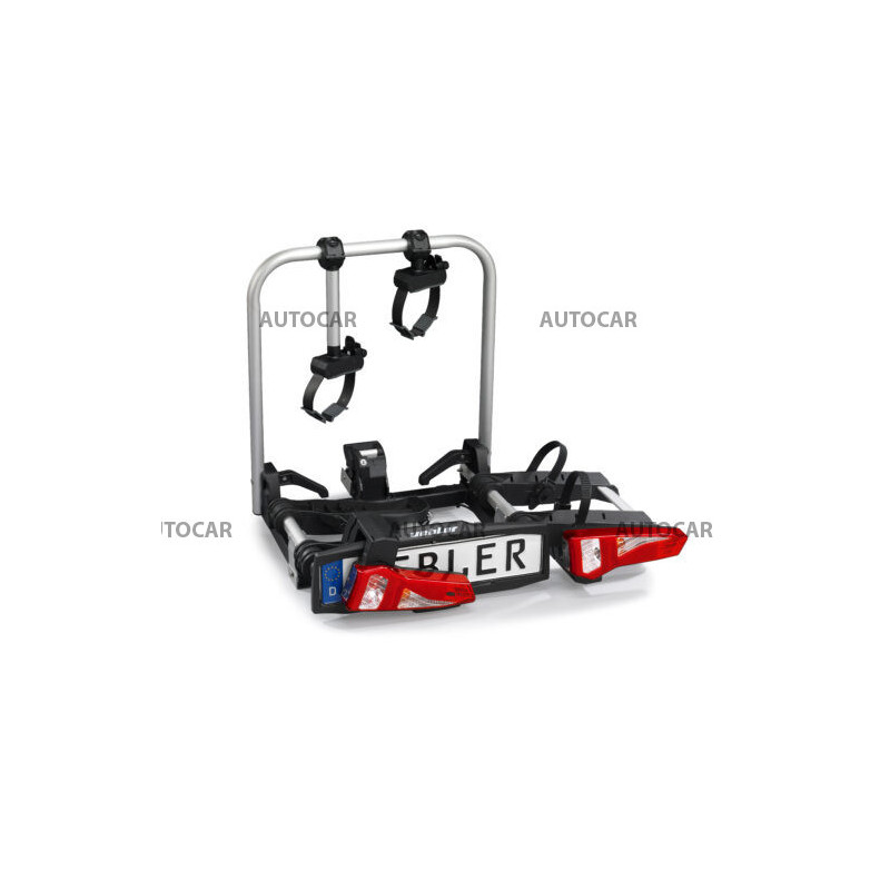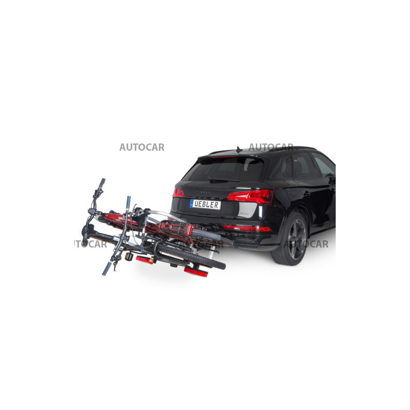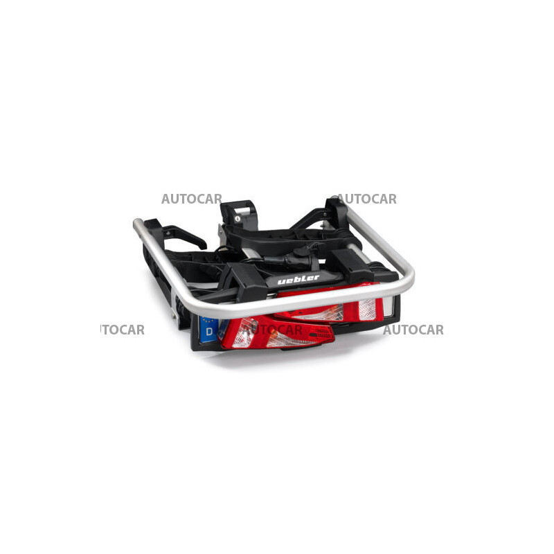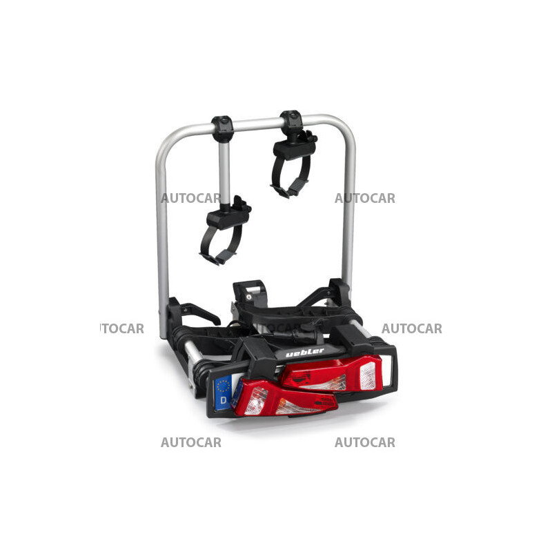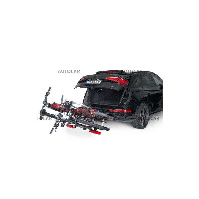Suport ușor și compact, pliabil la 90° pentru 2 biciclete, pentru VW T6, T7 Clasa V, ProAce Verso, cu instalare ușoară pe bara de remorcare datorită sistemului de eliberare rapidă IQ și cu fixare a bicicletei cu chingi pentru cadre late