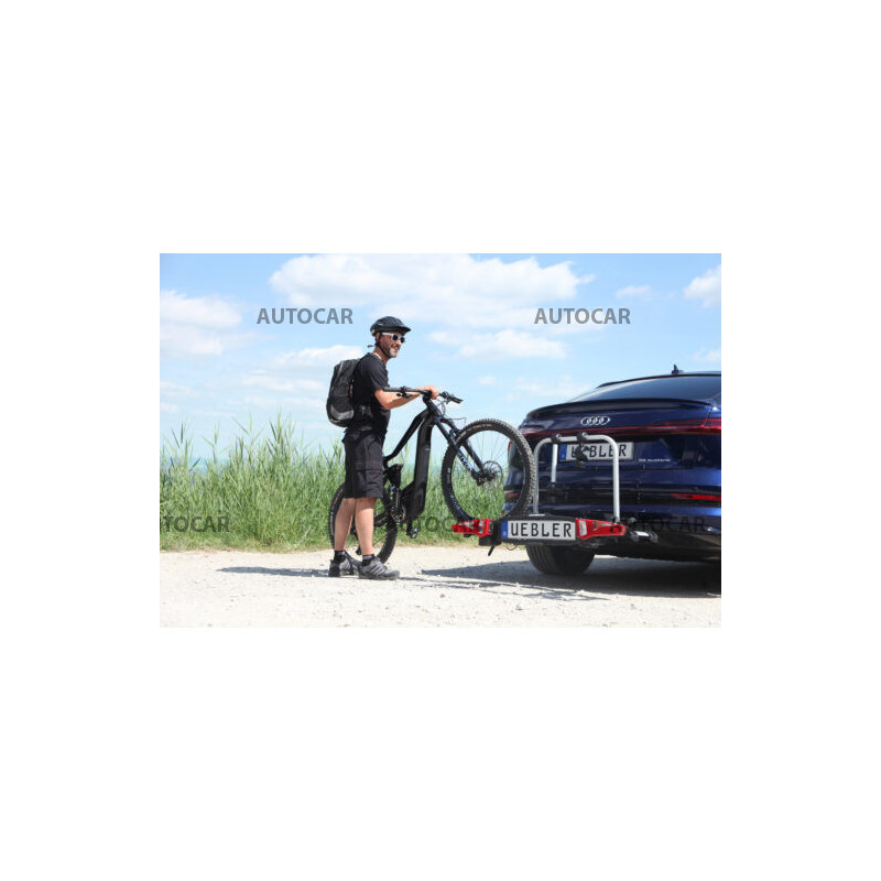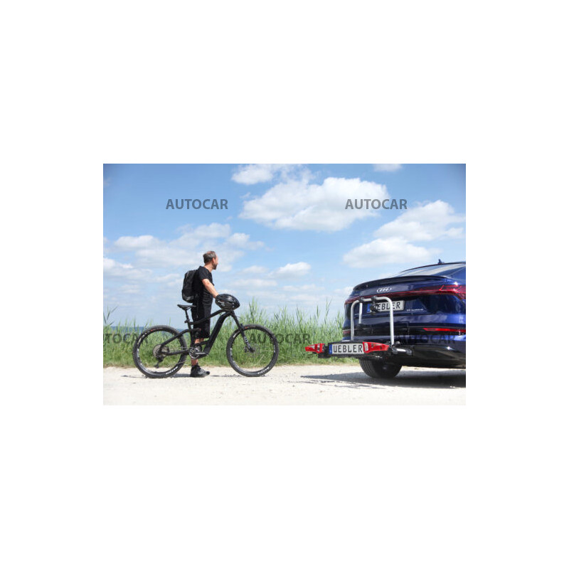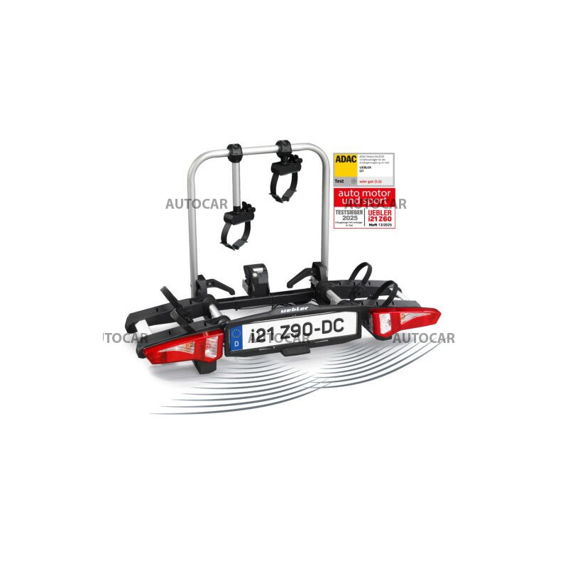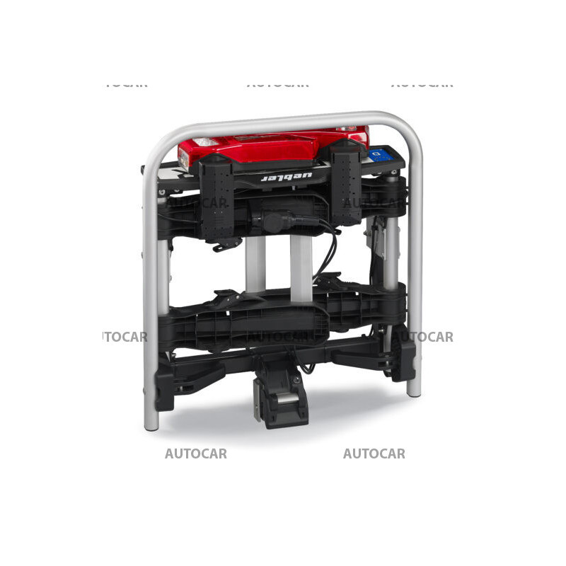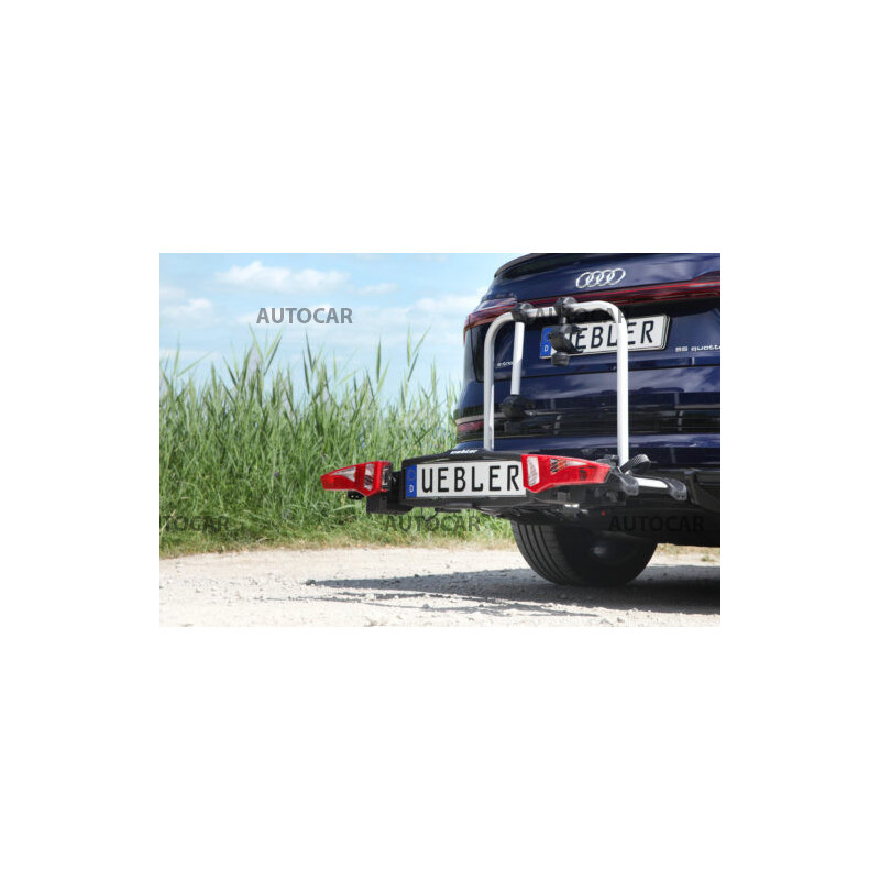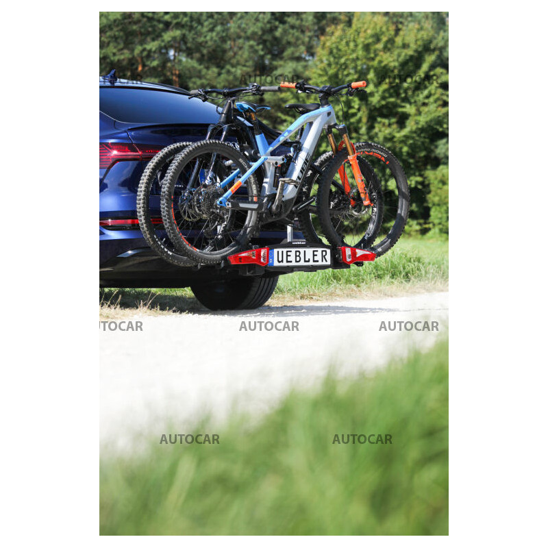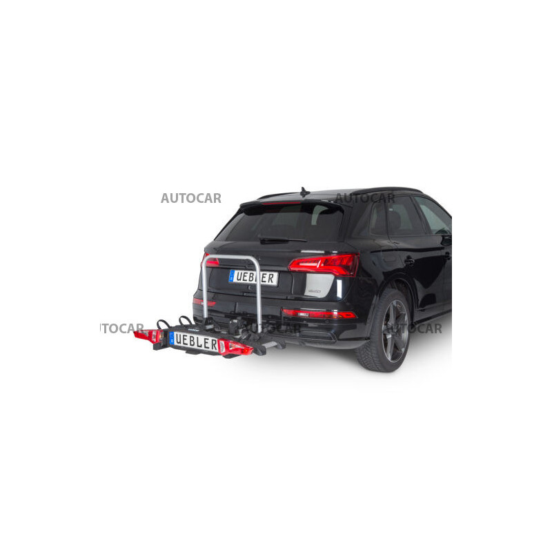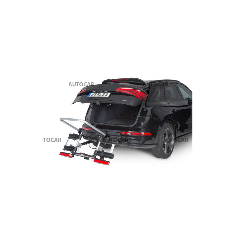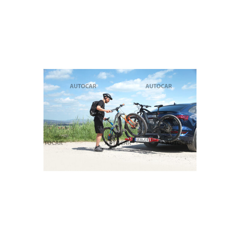 Suport ușor și compact pentru 2 biciclete cu senzori de parcare, înclinare la 90° pentru VW T6, T7, Clasa V, ProAce Verso, cu instalare ușoară pe bara de remorcare datorită sistemului de eliberare rapidă IQ cu fixare a bicicletei cu chingi pentru cadre late