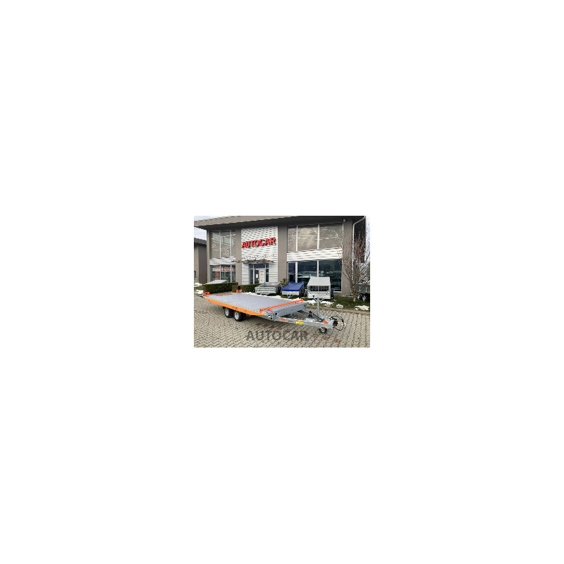 remorcă basculantă cu frânare cu o singură axă pentru transportul mașinilor cu podea completă din profile de aluminiu de înaltă calitate. Remorca are un pat rabatabil cu ajutorul hidraulicii manuale. Încărcarea ușoară a mașinii este garantată de caroseria alungită. Farurile din spate se rabatează inteligent, astfel încât să nu stea în cale când părăsești mașina. Construcția constă dintr-o construcție robustă din oțel sudat galvanizat la cald, care garantează o durată lungă de viață. Echipamentul de bază al remorcii include o roată de sprijin, pene, bară de oprire reglabilă, pliere hidraulică manuală, 12 ochi de ancorare încorporați în podea. Remorca este proiectată pentru o viteză de 100 km/h, dar poate fi reglată la 130 km/h pentru o taxă suplimentară.
