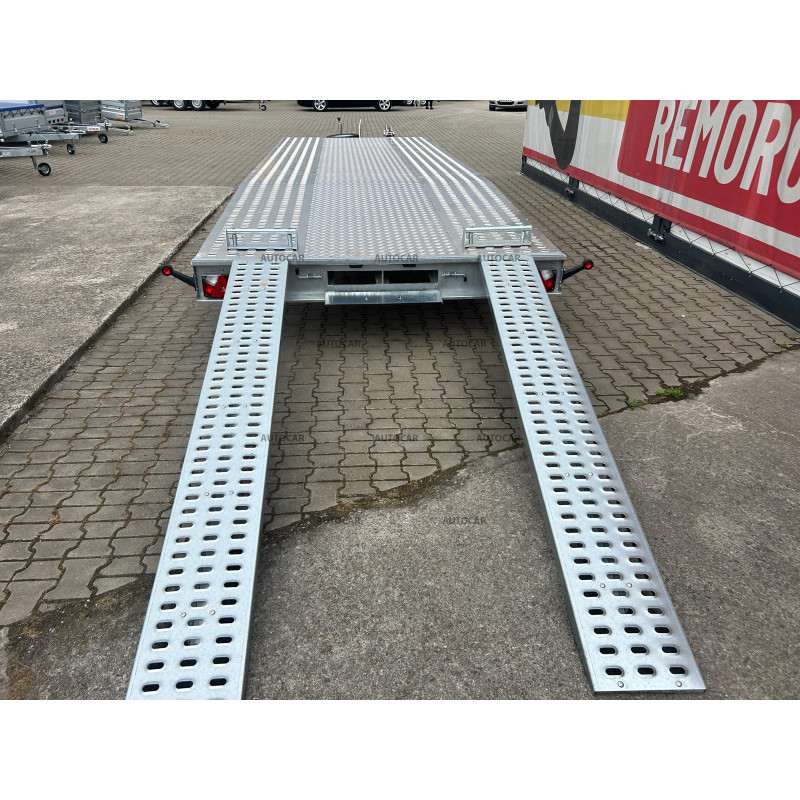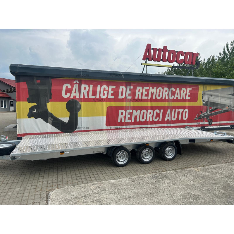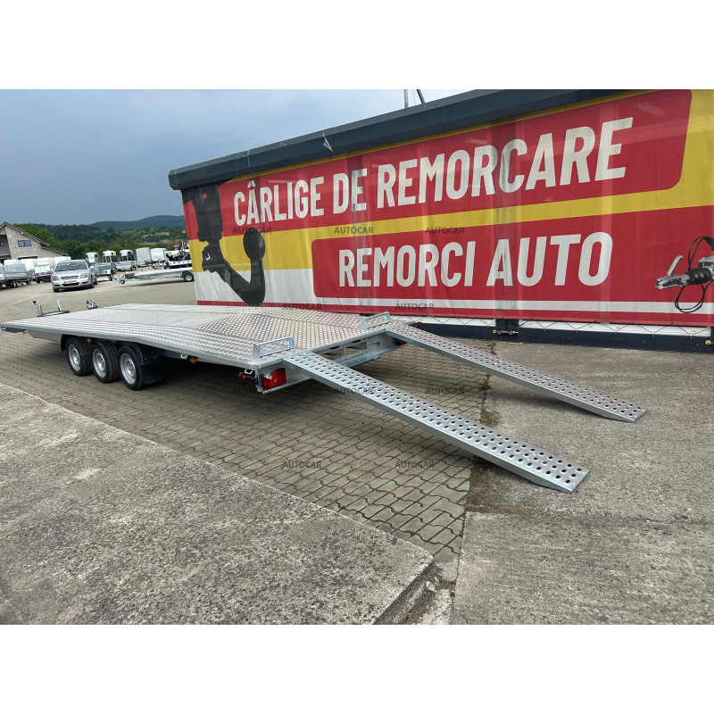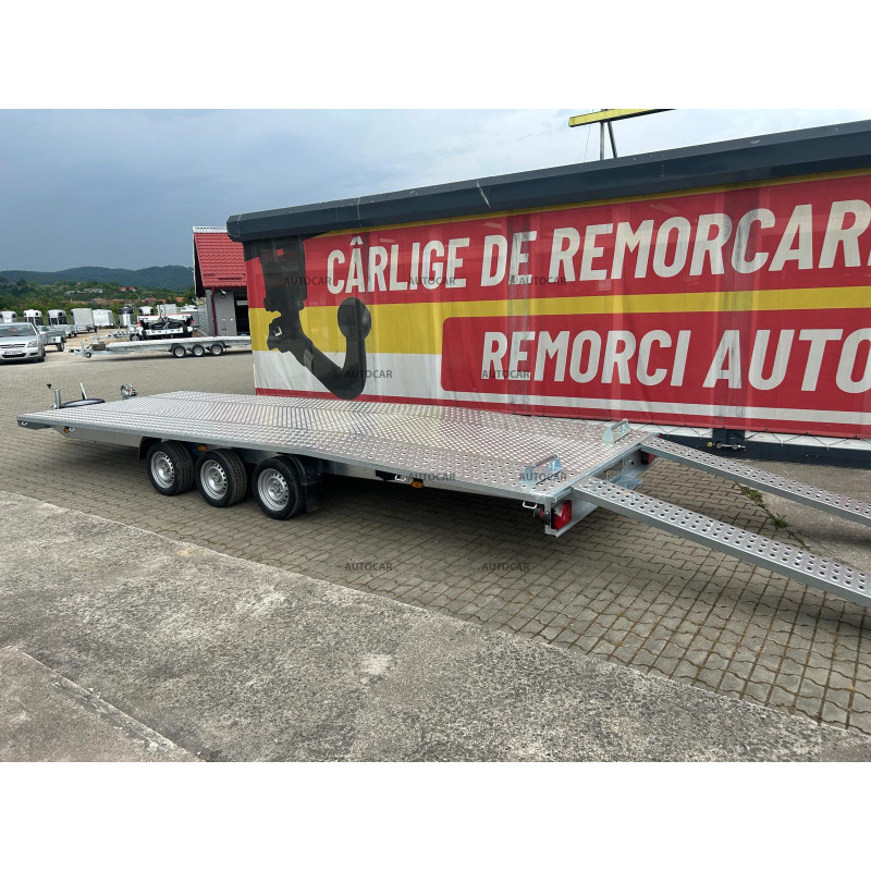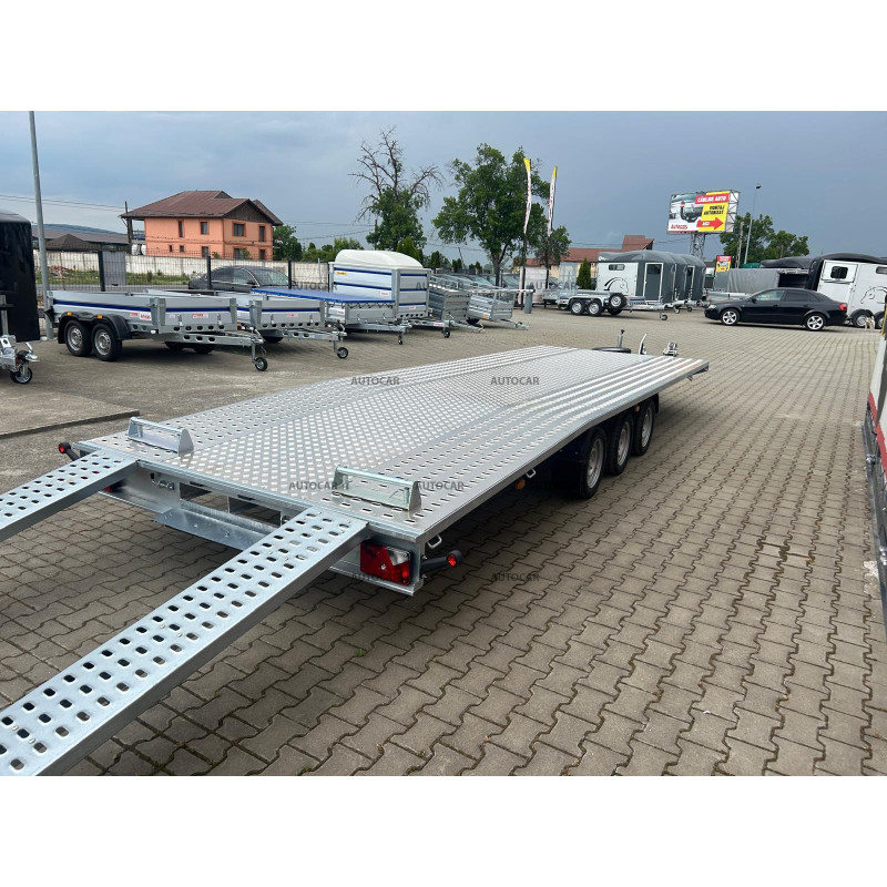 Această remorcă de marfă frânată cu trei axe este proiectată pentru transportul mașinilor și are un design unic, cu roți care sunt depozitate sub palatforma. Structura sa este realizată din construcție robustă din oțel, care a fost sudată și ulterior, galvanizată la cald, ceea ce asigură o rezistență ridicată la coroziune și o durată de viață lungă. viaţă. Prin calitatea și durabilitatea sa, această remorcă oferă o garanție de 2 ani, ceea ce arată încrederea în fiabilitatea și calitatea sa. Construcția sa a fost concepută pentru a permite transportul mașinilor cu viteze de până la 100 km/h, oferind astfel un transport eficient și sigur.