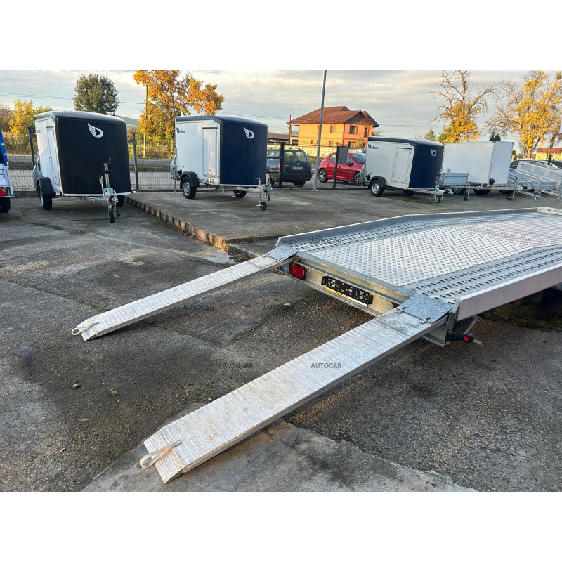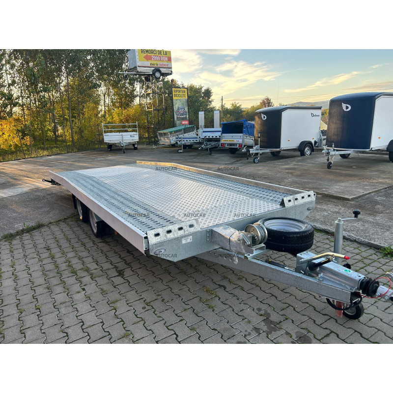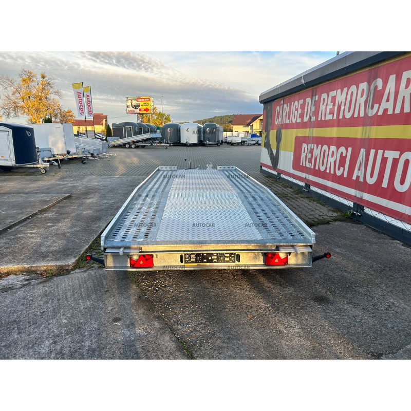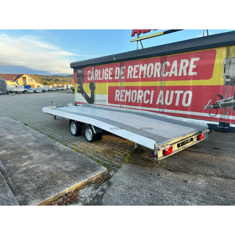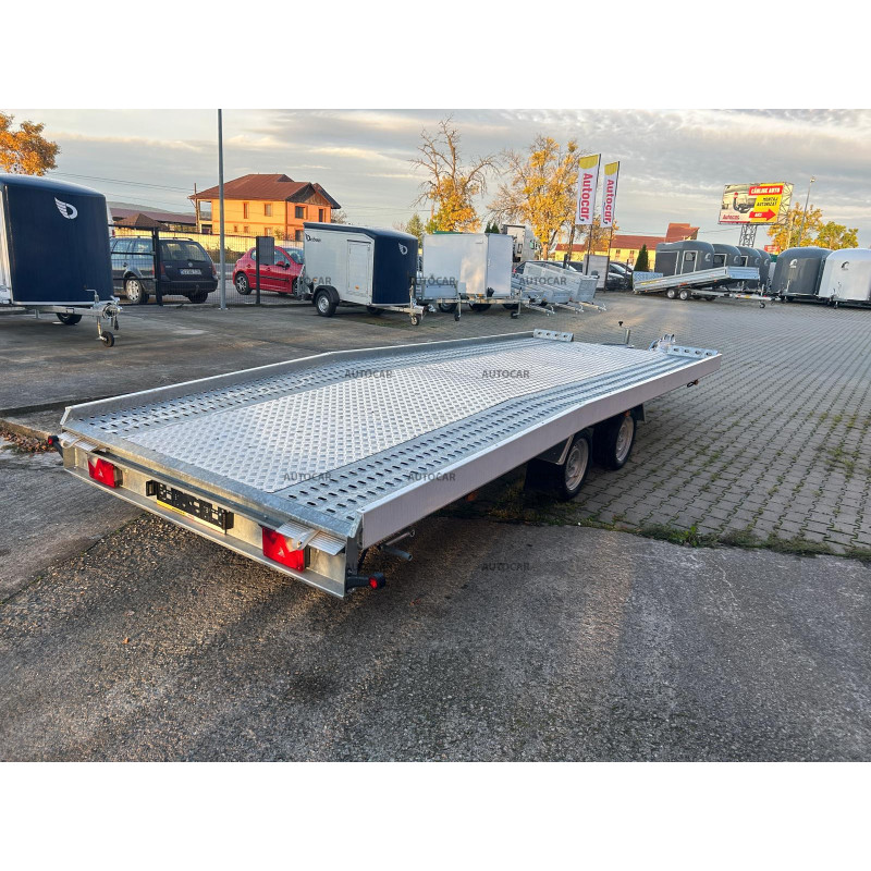 Această remorcă de marfă frânată cu doua axe este proiectată pentru transportul mașinilor și are un design unic, cu roți care sunt depozitate sub platforma . Structura sa este realizată din construcție robustă din oțel, care a fost sudată , galvanizată la cald, ceea ce asigură o rezistență ridicată la coroziune și o durată de viață lungă. . Prin calitatea și durabilitatea sa, această remorcă oferă o garanție de 2 ani, ceea ce arată încrederea în fiabilitatea și calitatea sa. Construcția sa a fost concepută pentru a permite transportul mașinilor cu viteze de până la 140 km/h, oferind astfel un transport eficient și sigur.