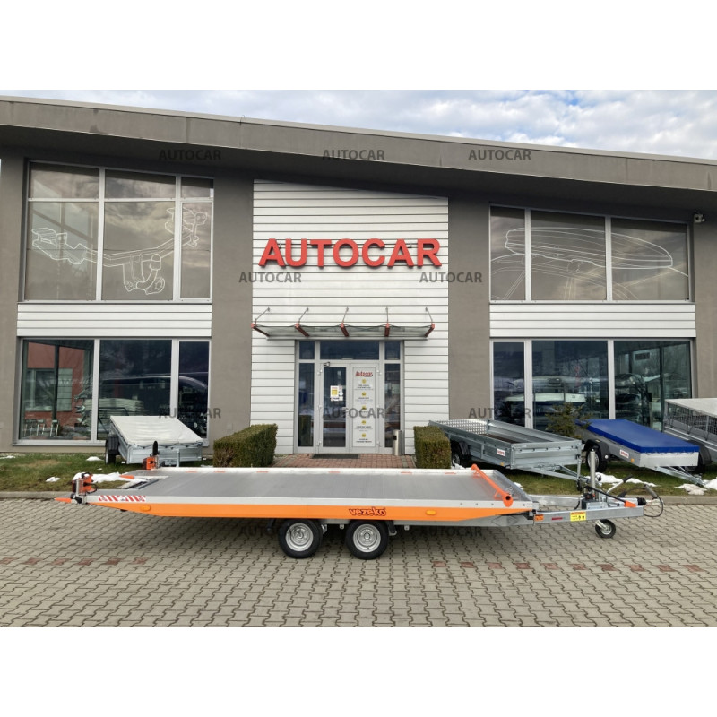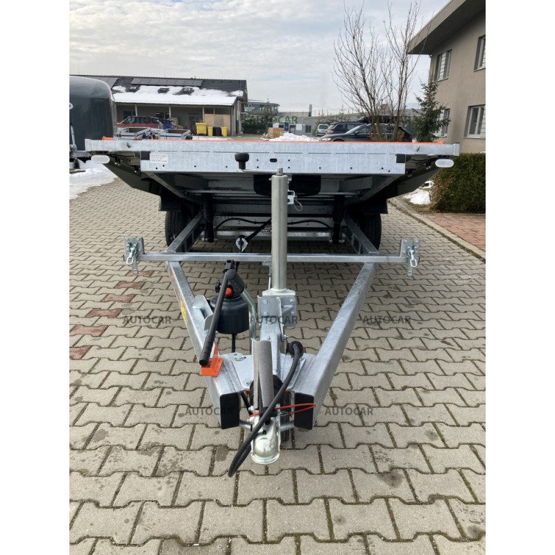 Remorcă cu două axe, sistem de frânare și basculabilă pentru transportul automobilelor cu podea completă din profile de aluminiu de înaltă calitate. Remorca dispune de platformă basculabilă acționată manual prin sistem hidraulic. Încărcarea simplă a automobilului este asigurată de corpul prelungit. Luminile posterioare sunt concepute să se rabateze pentru a nu împiedica ieșirea automobilului. Structura este realizată din oțel robust galvanizat la cald și sudat, garantând o durată lungă de viață. Dotările standard ale remorcii includ roată de sprijin, cale de blocare, bară de stop ajustabilă, înclinare hidraulică manuală, 14x ocheți de ancorare integrate în podea. Remorca este proiectată pentru o viteză de 100 km/h, dar contra cost poate fi adaptată pentru 130 km/h.