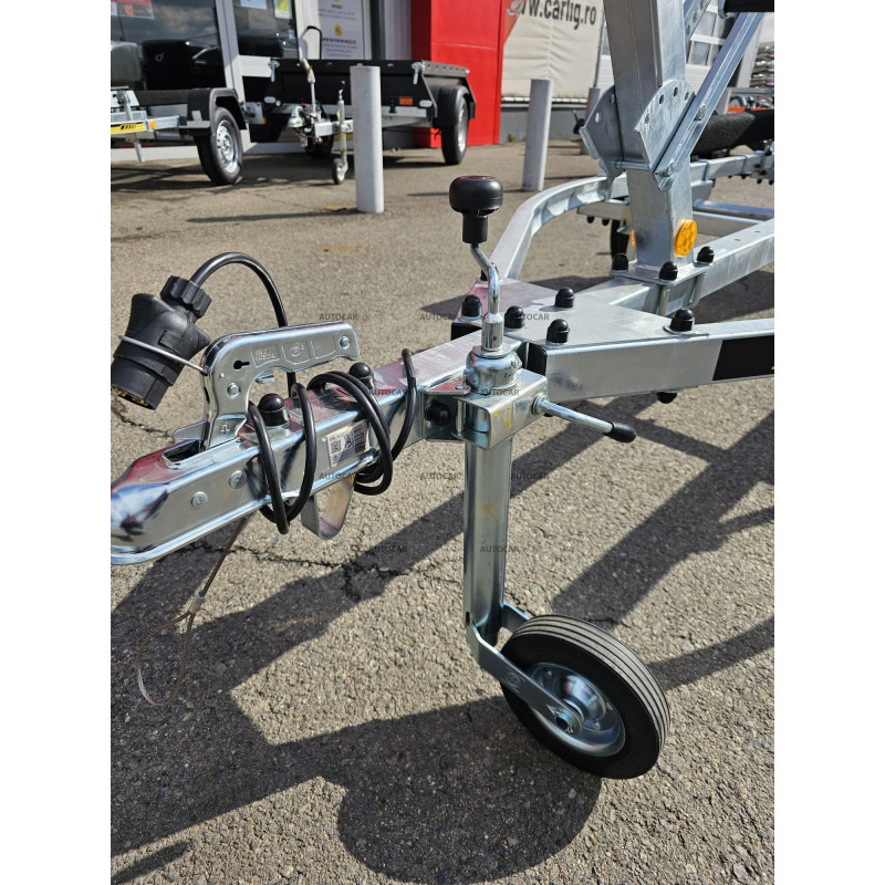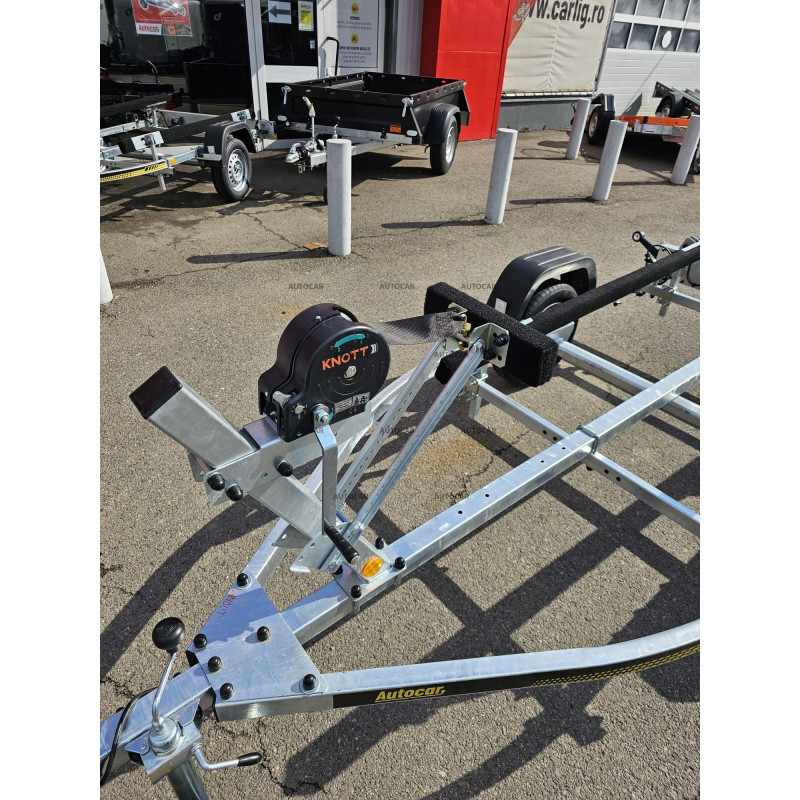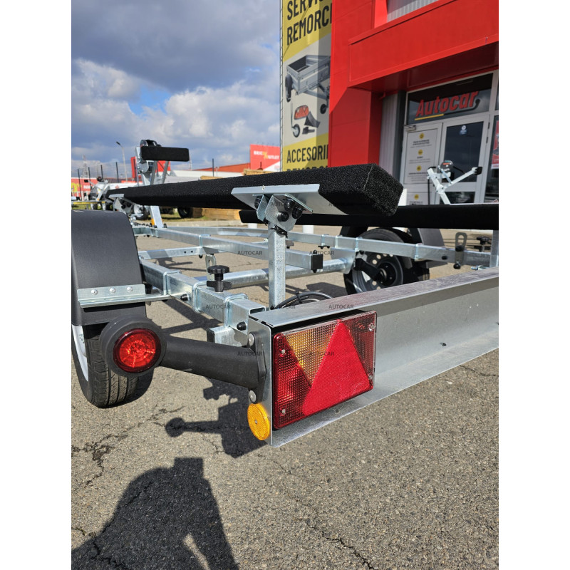 nefrânată cu o singură axă destinată transportului ambarcațiunilor cu lungimea maximă de 4200 mm. cadru de oțel al camionului este zincat la cald, ceea ce îi prelungește durata de viață chiar și în condiții solicitante. Echipamentul de bază include un troliu KNOTT de calitate cu o curea de înfășurare, 2 sine laterale, opritor pe vârful bărcii. Rampa luminii din spate poate fi demontată în mod ingenios, fără a folosi unelte speciale, datorită cărora este posibilă întoarcerea remorcii direct în apă și lansarea ambarcațiunii/ambarcațiunii cu ajutorul unui troliu. Puteți regla lungimea remorcii după cum este necesar. Axa remorcii poate fi, de asemenea, poziționată astfel încât să puteți distribui mai bine centrul de greutate.
