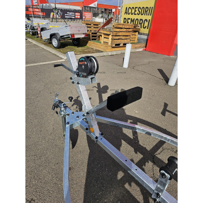 Remorcă fără sistem de frânare cu o singură axă destinată transportului ambarcațiunilor cu lungimea maximă de 4200 mm. cadru de oțel al camionului este zincat la cald, ceea ce îi prelungește durata de viață chiar și în condiții solicitante. Echipamentul de bază include un troliu KNOTT de calitate cu o curea de înfășurare, 2 linii centrale de chilă, 2 sine cu role laterale, opritor pentru barca. Rampa luminii din spate poate fi demontată în mod ingenios, fără a folosi unelte speciale, datorită cărora este posibilă întoarcerea remorcii direct în apă și lansarea ambarcațiunii/ambarcațiunii cu ajutorul unui troliu. Puteți regla lungimea remorcii după cum este necesar. Axa remorcii poate fi, de asemenea, poziționată astfel încât să puteți distribui mai bine centrul de greutate.